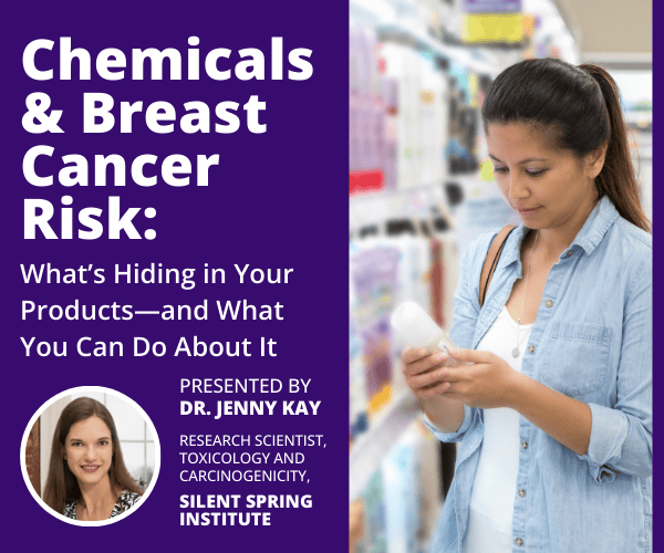 In this webinar, Dr. Jennifer Kay, Research Scientist at Silent Spring Institute, will explain the science behind endocrine-disrupting chemicals (EDCs) and their role in the development of breast cancer. She and her team have identified more than 900 chemicals linked to breast cancer. Dr. Kay will share where these chemicals are most often found—including plastics, personal care products, pesticides, pharmaceuticals, drinking water, and food packaging—and how reducing exposures can put you on a path to better health. She will also provide practical recommendations for apps and other resources you can use to select healthier products.