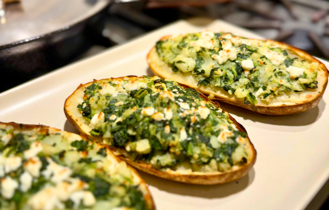 Once potatoes are cooked and cut in halves, scrape out the inside of the potatoes and combine it with the spinach mixture. Divide the spinach mixture between the 4 halves and gently press it down. It will slightly dome over the potato skin.