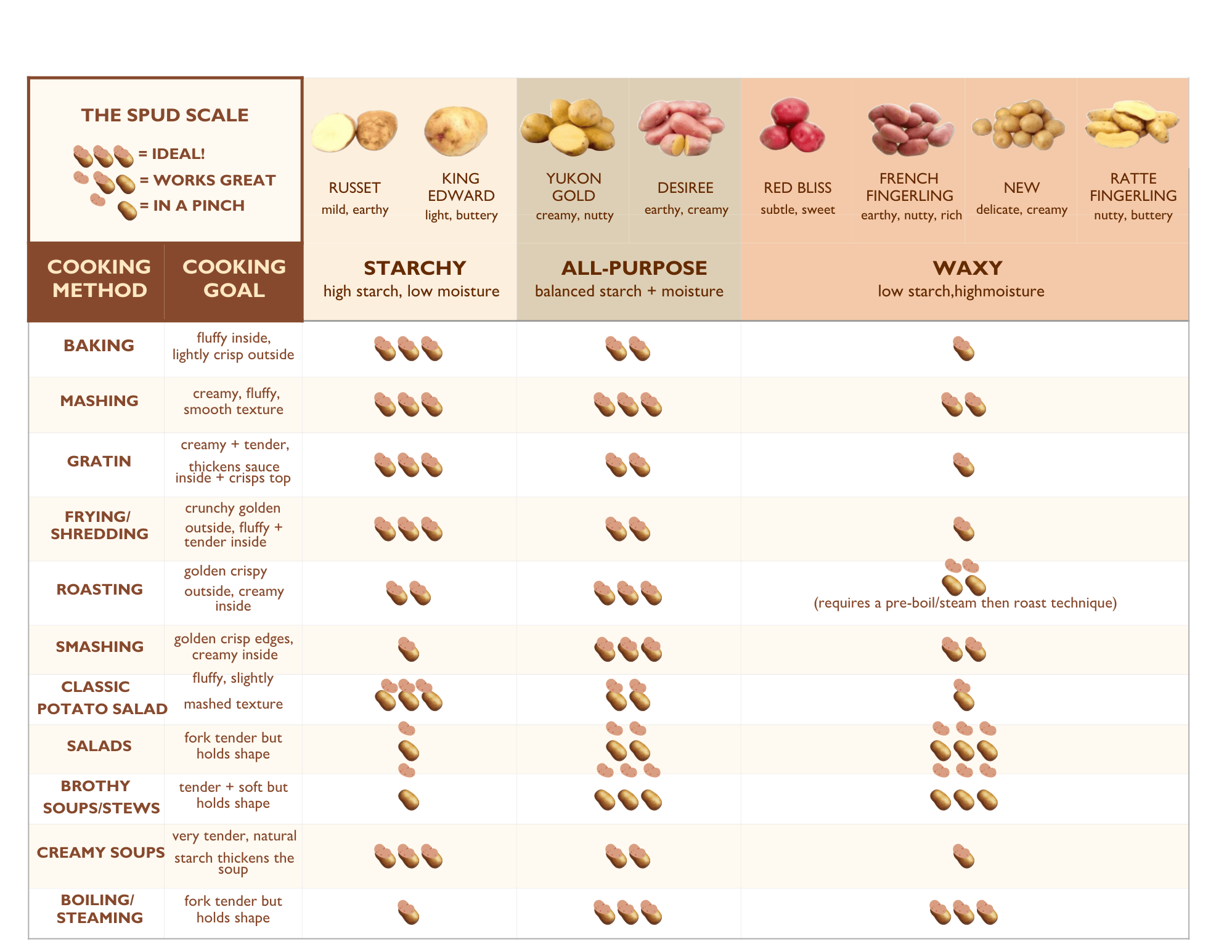 The Spud Scale: A quick, visual guide to choosing the right potato for the right job—from baking and mashing to roasting, soups, and salads. This chart highlights how different potato varieties perform across common cooking methods so you can get the best texture and flavor every time. View pdf of the Potato Chart below here. Created by Ananda Kaplan.